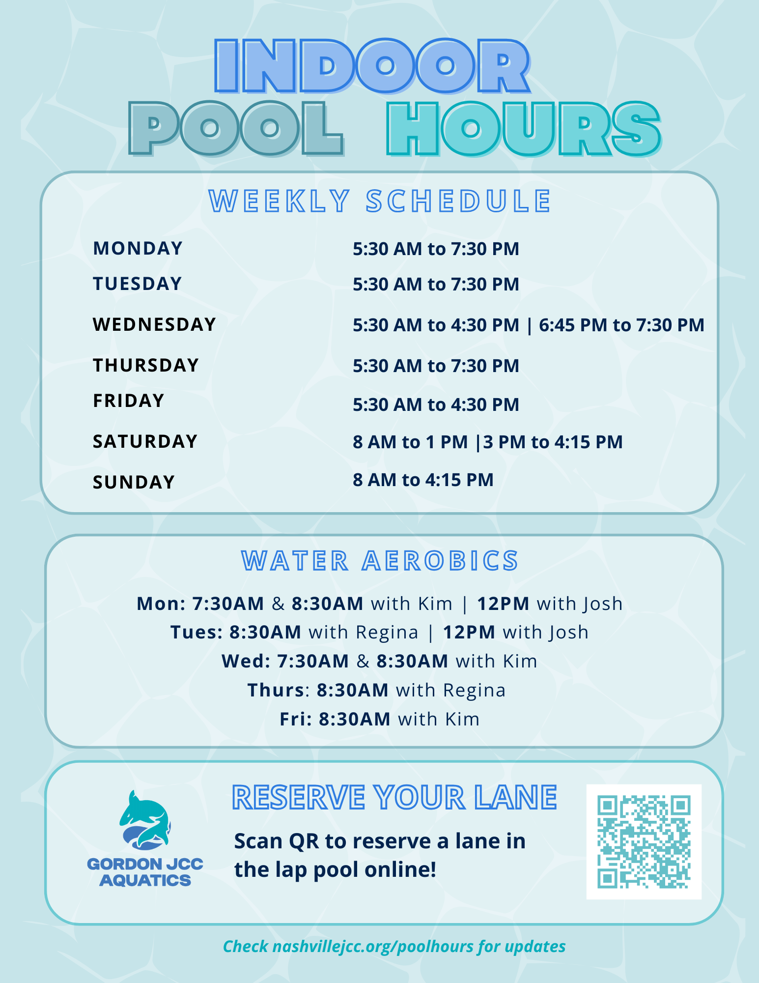 - Classes at 7:30 AM, Monday–Friday at the Outdoor Pool, with additional 12:00 PM classes on Tuesday & Thursday in the Indoor Pool.