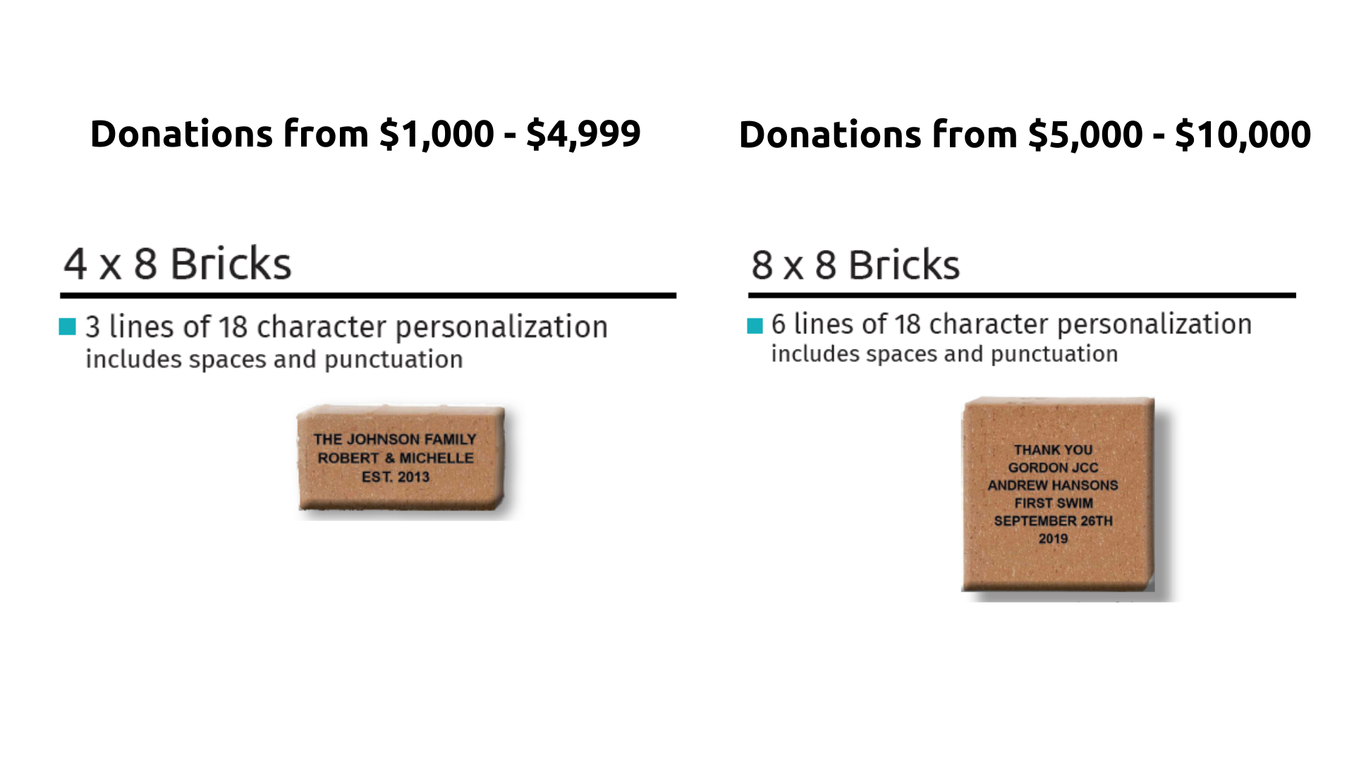 Your support of the Gordon JCC Our Community. Our Future. Capital Campaign can be made in one of two ways: A one-time donation, or a pledge over multiple years. All donations in excess of $1,000 receive a customized brick paver to be placed on our campus. Click the button below that is relevant to your donation choice, and be sure to continue onto the paver form if your donation is eligible. Thank you for you support!
