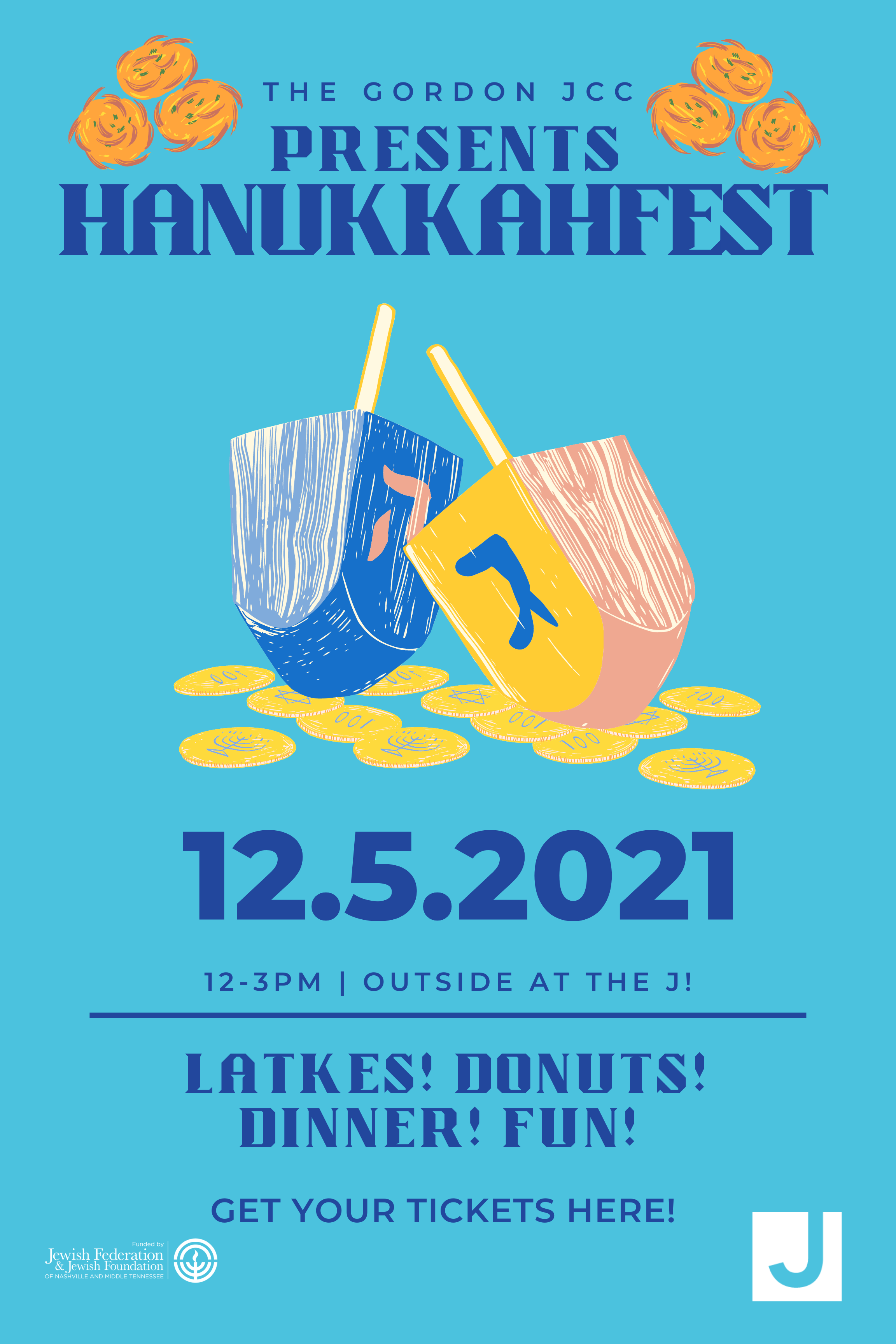 Come together for Latkes! Donuts! Lunch! and Fun! at the 8th annual Gordon JCC Hanukkah Fest. We are so excited to welcome you all back in person for a chance to connect with your peers and community. We will be outside in the ECLC parking lot under a beautiful tent with warm hot chocolate and cider and of course games and lots of delicious food, including Bernie Pargh's famous latkes for kids and adults. We hope to see you and your family there!